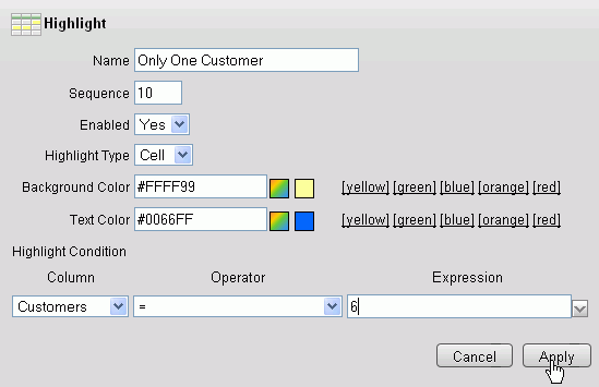 You want to highlight the Customers cell when the value is set to 6. From the Column drop-down list select Customers. Then enter 6 for the Expression and click Apply.