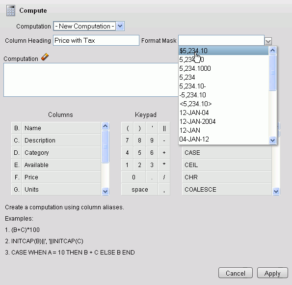 You want to create a computation column that has the calculation Price * 1.05. Enter Price With Tax for the Column Heading and select the down arrow for the format mask and select $5,234.10.