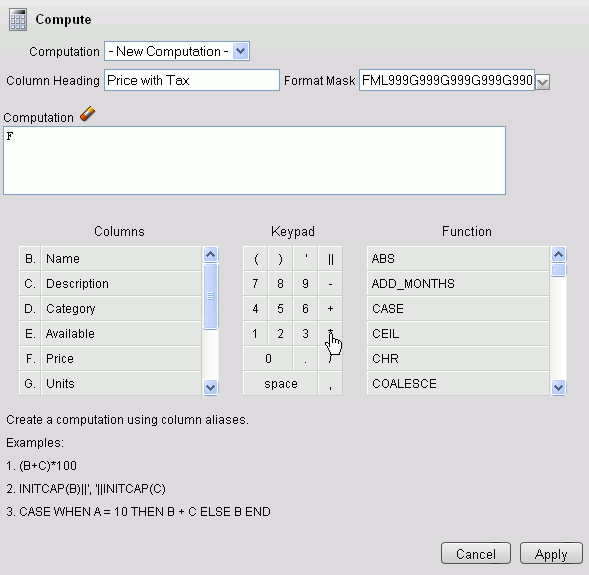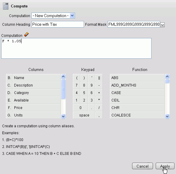 This action is used to add computed columns to your report. These can be mathematical computations (e.g. NBR_HOURS/24) or standard Oracle functions applied to existing columns (some have been displayed, for example, others, such as TO_DATE, can also be used). Perform the following steps:
