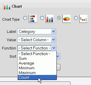 Select Count for the Function. Note: You do not select a column for Value in this case because you are doing a count. For other functions, you would select a Value column.