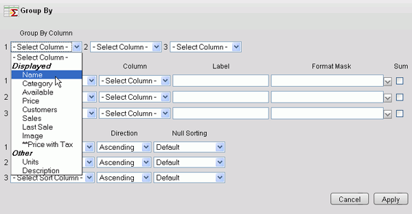 Note: The null sorting field indicates where null values should appear in the report for the column being sorted. If set to default, nulls will default to the value set in the Direction field for this sort entry. You can also force nulls to always show first or last.