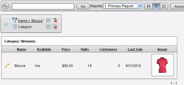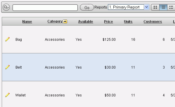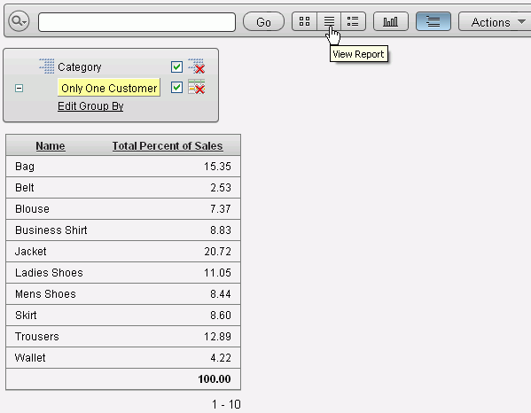 The Group By report is displayed. Notice that each product is listed with its percentage of the total sales. Click the View Report icon to return to your previous report.