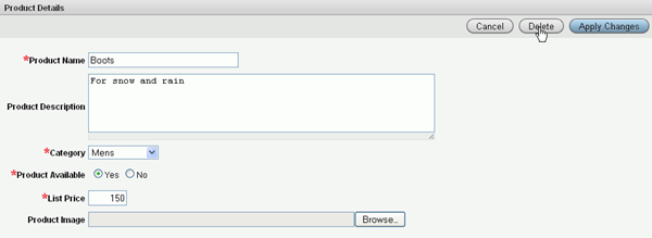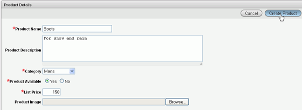Enter Boots for the Product Name, Snow and rain for the Description, select Mens from the Category list, make sure Yes is selected for Product Available and 150 is entered for the List Price. Click Create.