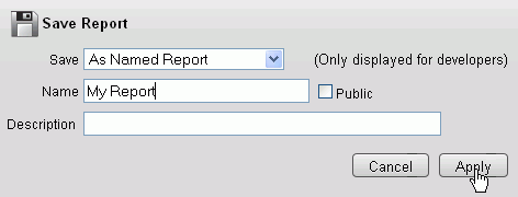 Enter a name for the report and click Apply. Note that you can create a Public report that can be accessed by all users if you click the Public check box. In this case, you want to just create a Private report that only you can view. If another user logs into the application, that user will not see your Private report.