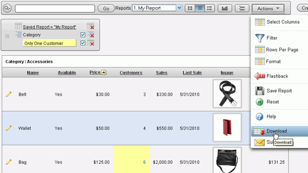 This action is used to download the current result set. The download formats will differ depending upon your installation and report definition but may include CSV, HTML, EMAIL, XLS, PDF, or RTF. Perform the following steps: