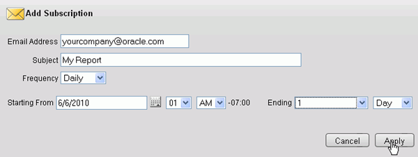 This action is used to subscribe to a report that will be sent via email for a specified length of time. Perform the following steps: