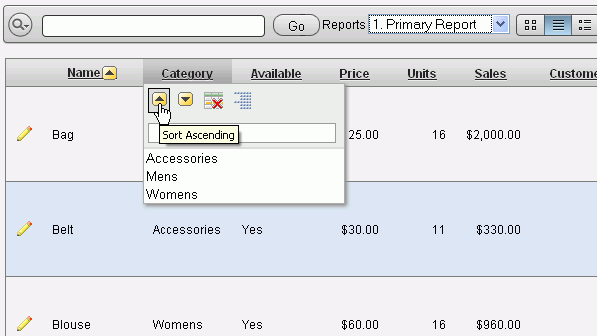 Notice that the report is now sorted by Price. The sort indicator is located next to the columns that are sorted. The arrow indicates whether it is in ascending or descending order.
