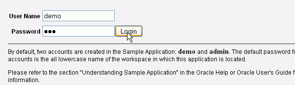 Login as the obe user and the password is the all lowercase name of the workspace in which this application is located. Hint: the workspace name is displayed in the lower left corner of the application home page.