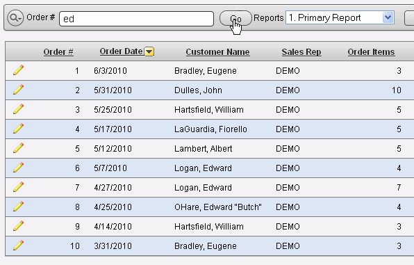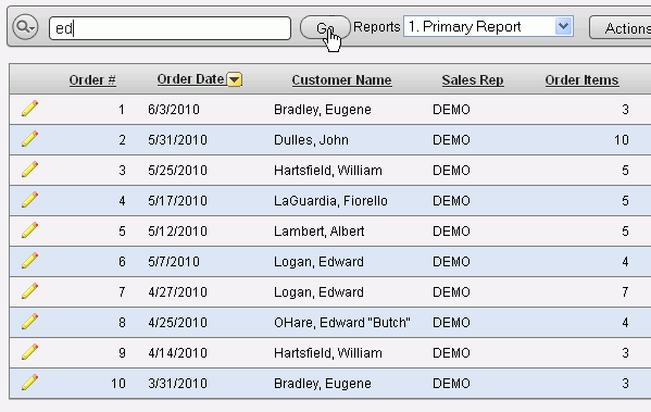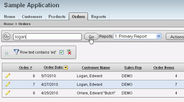Enter ed in the text area and click Go. Note: when the Sample Application is installed, the dates are updated so that the orders are current. As a result, you may have slightly different data in your report.