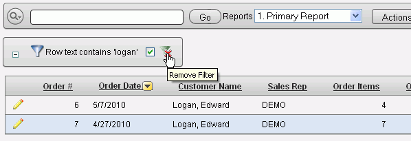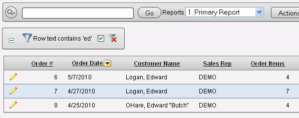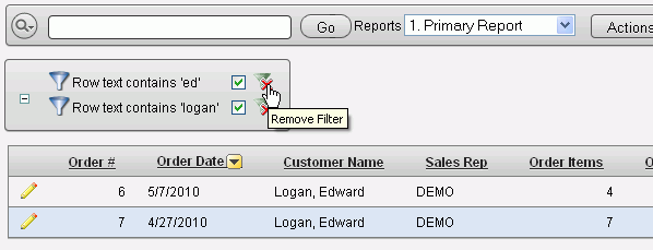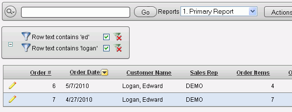 The search is not case sensitive, so it finds 'Ed' in the Customer Name. Notice that the filter shown below no longer has the word in the text area which allows you to create multiple filters.