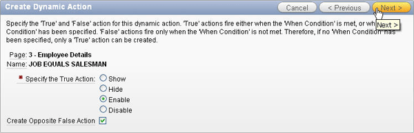 Select Enable for Specify the True Action. This action will be invoked when the value of P3_JOB is equal to 'SALESMAN'. Note that the Create Opposite False Action is checked, which will create a Disable action that will be invoked when the value of P3_JOB is not equal to SALESMAN. Click Next >.