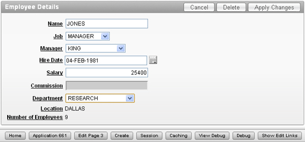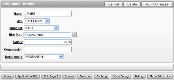 Notice the changes to the labels, and the Job, Manager and Department fields are now select lists. In the next section, you will create a Dynamic Action to enable the Commission item only when the Job is equal to SALESMAN. Select the Edit Page 3 link in the developer toolbar.