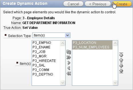 This page contains the page elements the dynamic action should control. In this case, you want to set the value of the P3_LOCATION, P3_NUM_EMPLOYEES items. Select Item(s) for Selection Type and select P3_LOCATION, P3_NUM_EMPLOYEES for Item(s) and click Create.