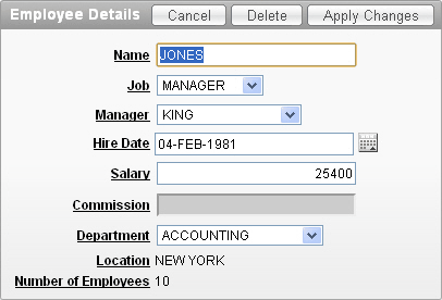 Change the Job to SALESMAN and notice that the Commission field gets enabled. Select the Edit Page 3 link in the developer toolbar.