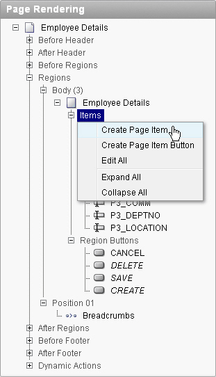 In the Page Rendering area under Regions, locate the P3_JOB item under the Employee Details region. Right click P3_JOB and select Edit.