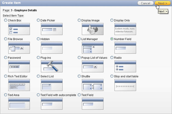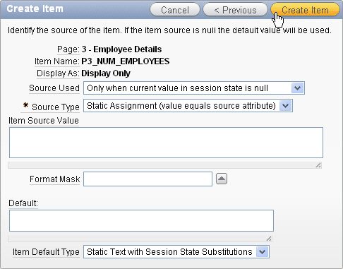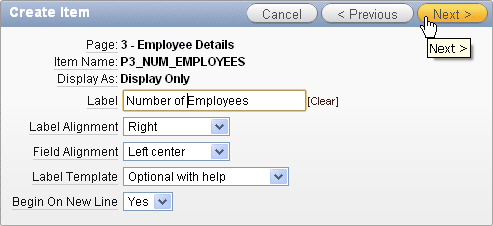 Enter P3_NUM_EMPLOYEES for Item Name and click Next >.