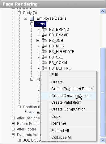 Now you can create the Dynamic Action to set the value of the new P3_LOCATION and P3_NUM_EMPLOYEES items. You want the department's location and the number of employees to be displayed when the value of the Department changes. Right click P3_DEPTNO and select Create Dynamic Action.