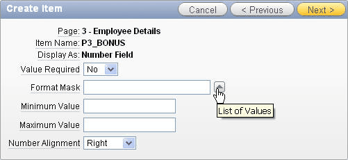 Select Yes for Display Extra Values, select Yes for Display Null Value, and enter -- Select Department -- for Null Display Value. Enter the following SQL statement in the List of values definition area and click Apply Changes. Select dname d, deptno r from dept