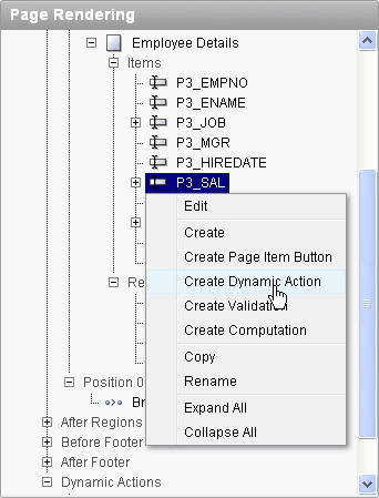 Now you are ready to create the dynamic action. Right-click the P3_SAL item and select Create Dynamic Action.