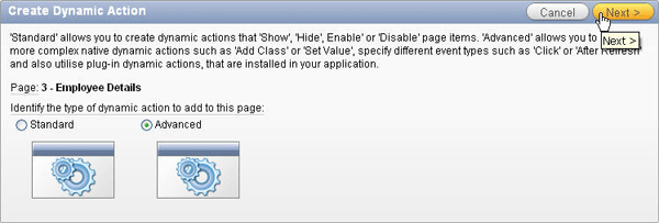 Select Standard and click Next >. Note that a Standard dynamic action allows you to create a dynamic action that will fire when a field's value changes, and will subsequently 'Show', 'Hide', 'Enable', or 'Disable' other page items.