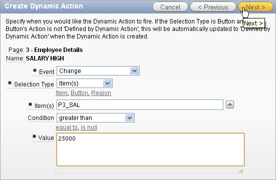 You want the Dynamic Action to be fired when the Job item is equal to SALESMAN. Because you created a dynamic action on the P3_JOB item, the values for Selection Type, Item(s) and Condition should already be specified. Enter SALESMAN for Value. Then click Next >.