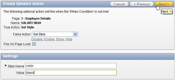 You also need to select the action that will take place when the action is false. Select Set Style for False Action and enter color for Style Name and black for Value. These 'False' action settings will be invoked when the salary value is not greater than 25000. Click Next >.