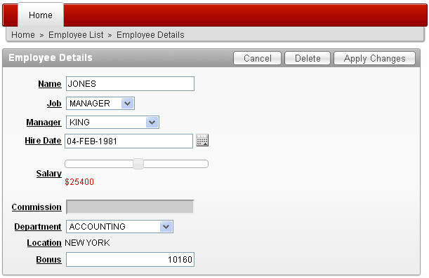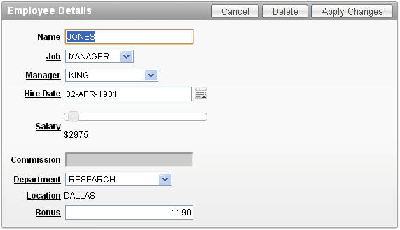 Change the Job to CLERK. Alternatively, you could change the value of the Salary which would also invoke the dynamic action. Notice that the bonus was recalculated automatically. Select the Edit Page 3 link in the developer toolbar.