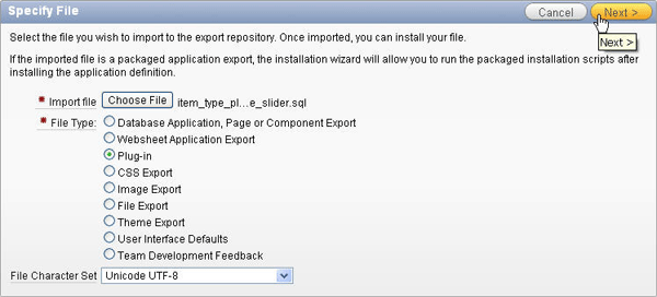 Click the Choose File button to locate the file. Select the item_type_plugin_com_oracle_slider.sql file in the files directory and click Open.