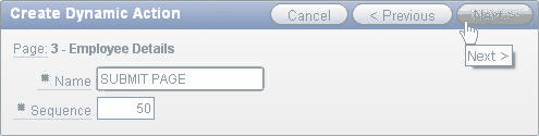 Select Submit Page for Action and enter SAVE for Request / Button Name. Setting this value to be the same as the button name will ensure that the button's 'Execute Validations' attribute is respected during page processing and also that any page processing components defined to fire when this button is pressed will also still fire when expected. Click Next >.