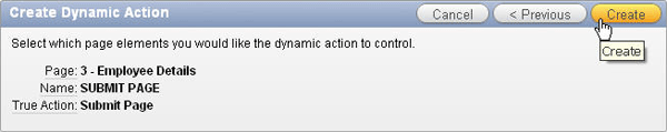 Click Create. When a dynamic action is created on a button, the button's Action property is automatically changed to "Defined by Dynamic Action."
