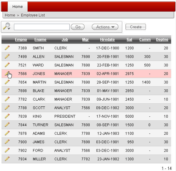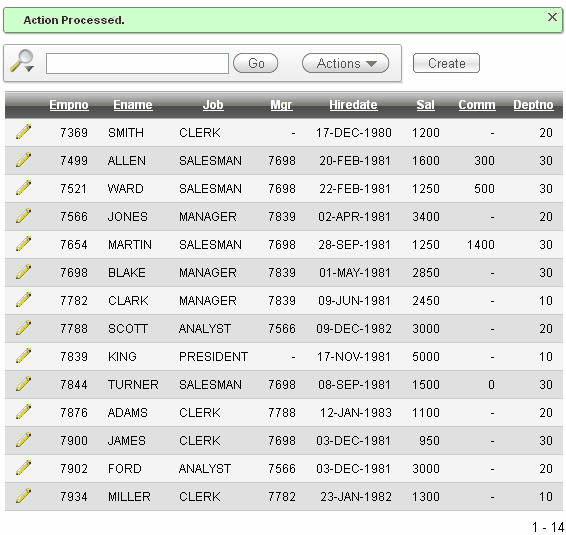 The changes are saved to the database and you are returned to the reports page. Notice that during the few seconds the SAVE action is being processed, it is possible to click the button again or make some other change to the form. To avoid this situation, you will create a dynamic action on the Apply Changes button. Click the edit icon of the employee you just edited.