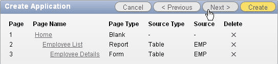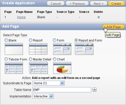 You want to create an Interactive Report and a Form on the EMP table. Select Report and Form for Page Type. Select Home(1) for Subordinate to Page, EMP for Table Name, and click Add Page.