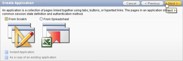 To create a database application with a few initial pages, log into your application express workspace and perform the following steps: