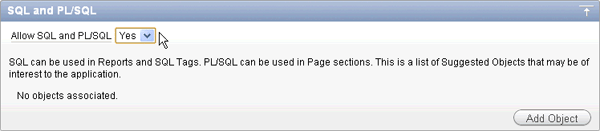 The Application Properties page in the Application Express development environment opens. Select Yes for Allow SQL and PL/SQL.