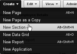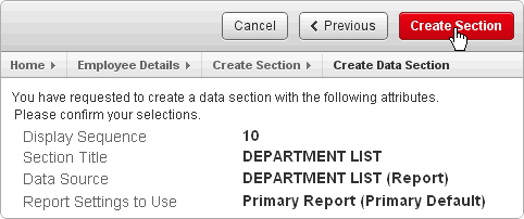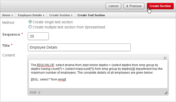 Enter Employee Details for Title and copy paste the text from the sql.txt file in the Content field. Note the use of the SQL and SQLVALUE tags. Then , click Create Section.