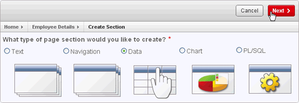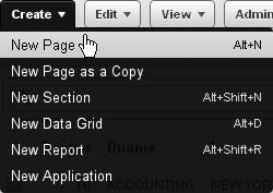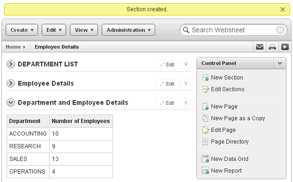In this topic, you will create a new page in the websheet application and create a data section based on the report you created in the previous section. Perform the following steps: