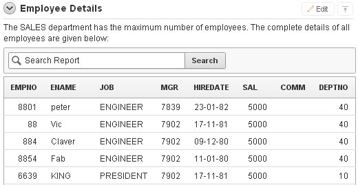 Enter Department and Employee Details for Title and expand the PL/SQL Example region.