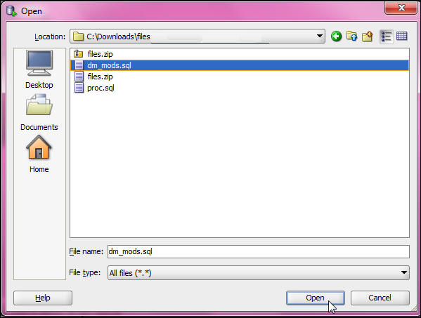 Locate the dm_mods.sql file from C:/Downloads/files and click Open.