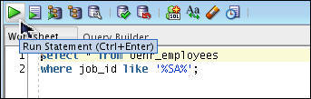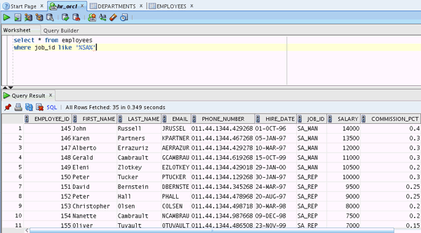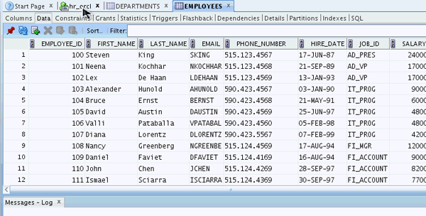 The data in the EMPLOYEES table is displayed. You can also enter a SQL statement in the SQL Worksheet. Click the hr_orcl tab.