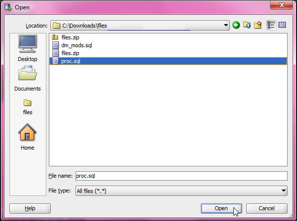 Locate the proc.sql from C:\Downloads\files directory and click Open.