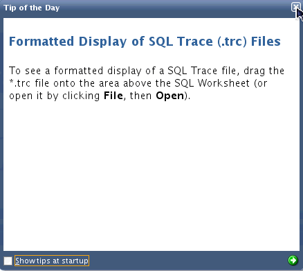The first time SQL Developer is open, you may receive a Tip of the Day dialog. You can deselect the Show tips at startup checkbox to turn it off and then click the Close icon in the upper right corner of the dialog.