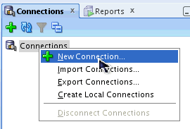 You now need to create a connection to the unit_test_repos user. This user will hold the unit testing repository data. Right-click Connections and select New Connection.