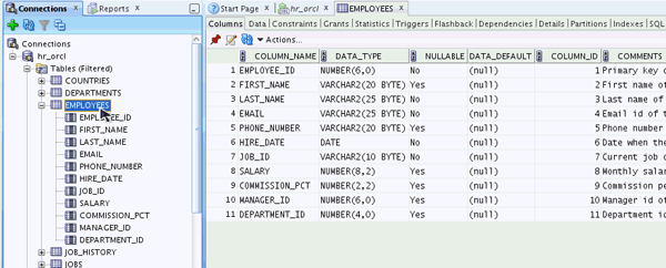 Expand the EMPLOYEES table. Notice that the column definitions are listed.