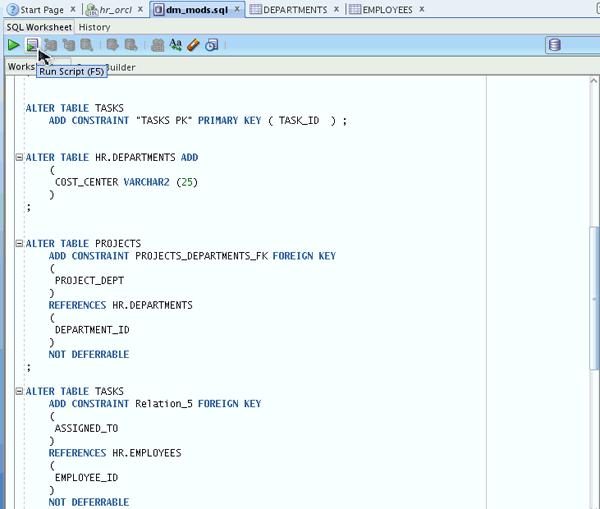This SQL file contains all the DDL to change the HR Schema so that it is synchronized with the model changes you made in the previous tutorial. When you execute this script, the PROJECTS and TASKS tables will be created, and the new COST_CENTER column will be added to the DEPARTMENTS table. Scroll down to review the DDL.