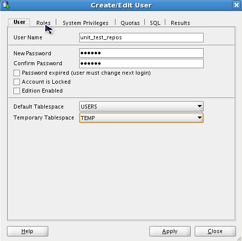 In this topic, you create a database user called UNIT_TEST_REPOS. You create this user to hold the Unit Testing Repository data. You will then create the repository in the schema of the user that you created.