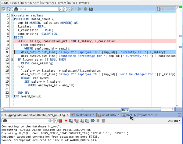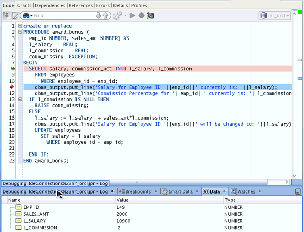 Notice the values for l_salary and l_commission have changed to the existing values in the database. Click the Debugging tab.
