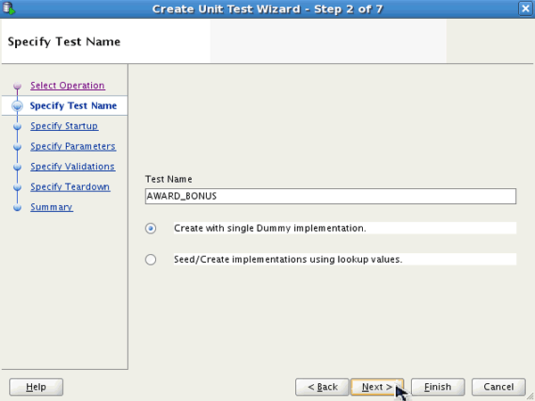 In Specify Test Name window, make sure that AWARD_BONUS is specified for Test Name and that Create with single Dummy implementation is selected, then click Next.