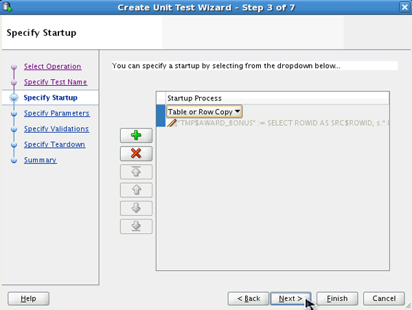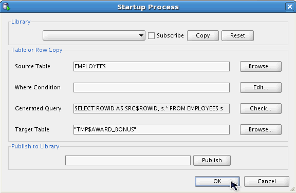 In Specify Startup window, click '+' icon and select Table or Row Copy from the drop down list box.