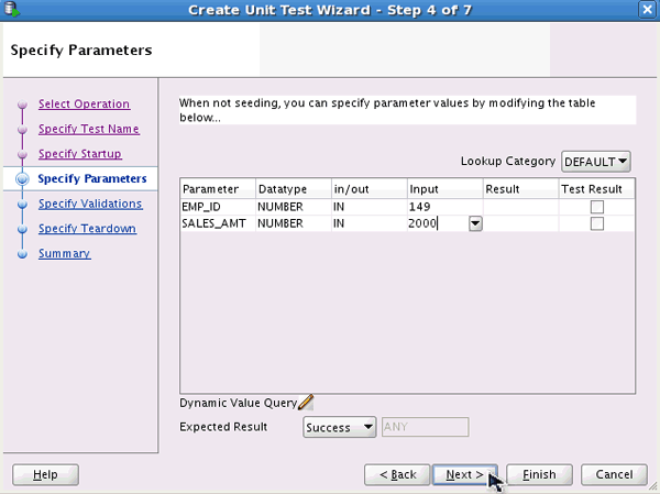 In the Specify Parameters window, change the Input string for EMP_ID to 149 and SALES_AMT to 2000 and click Next.
