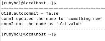 Update the transaction.rb script and uncomment conn1.autocommit = true and save the file. Execute the script again using the following command: ruby transaction.rbNow conn2 knows there is something new. The output is shown in the screenshot.